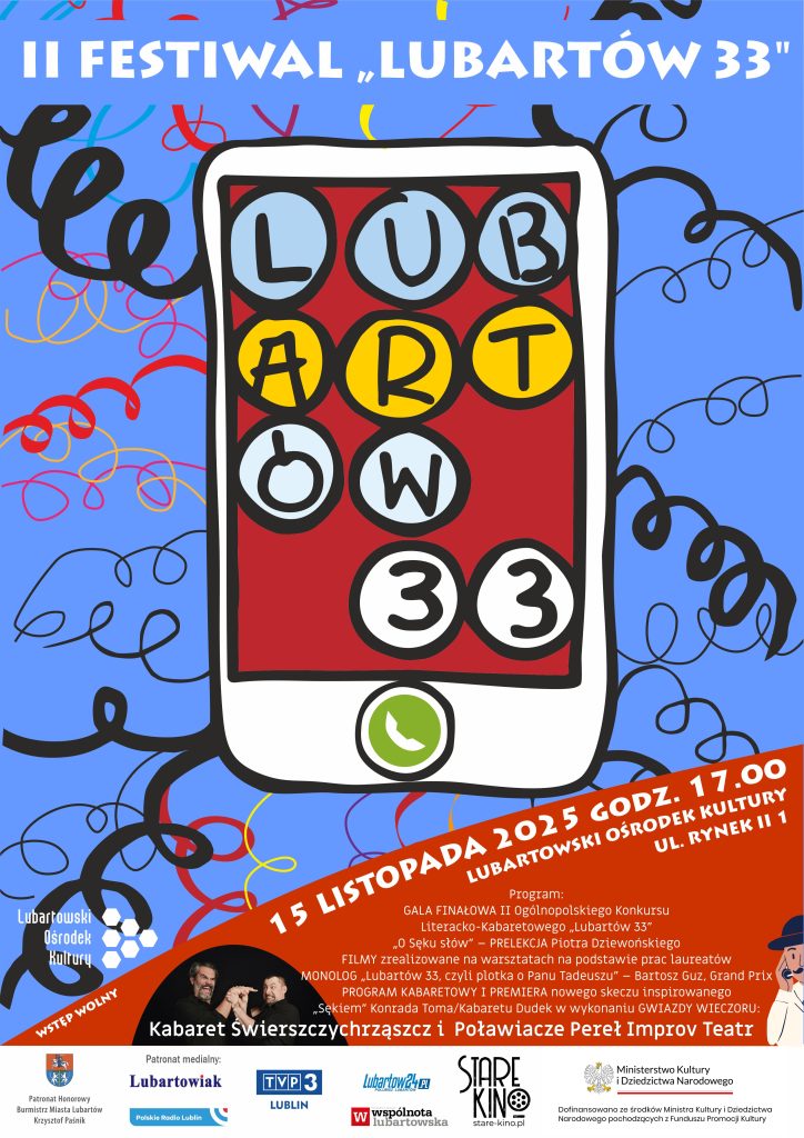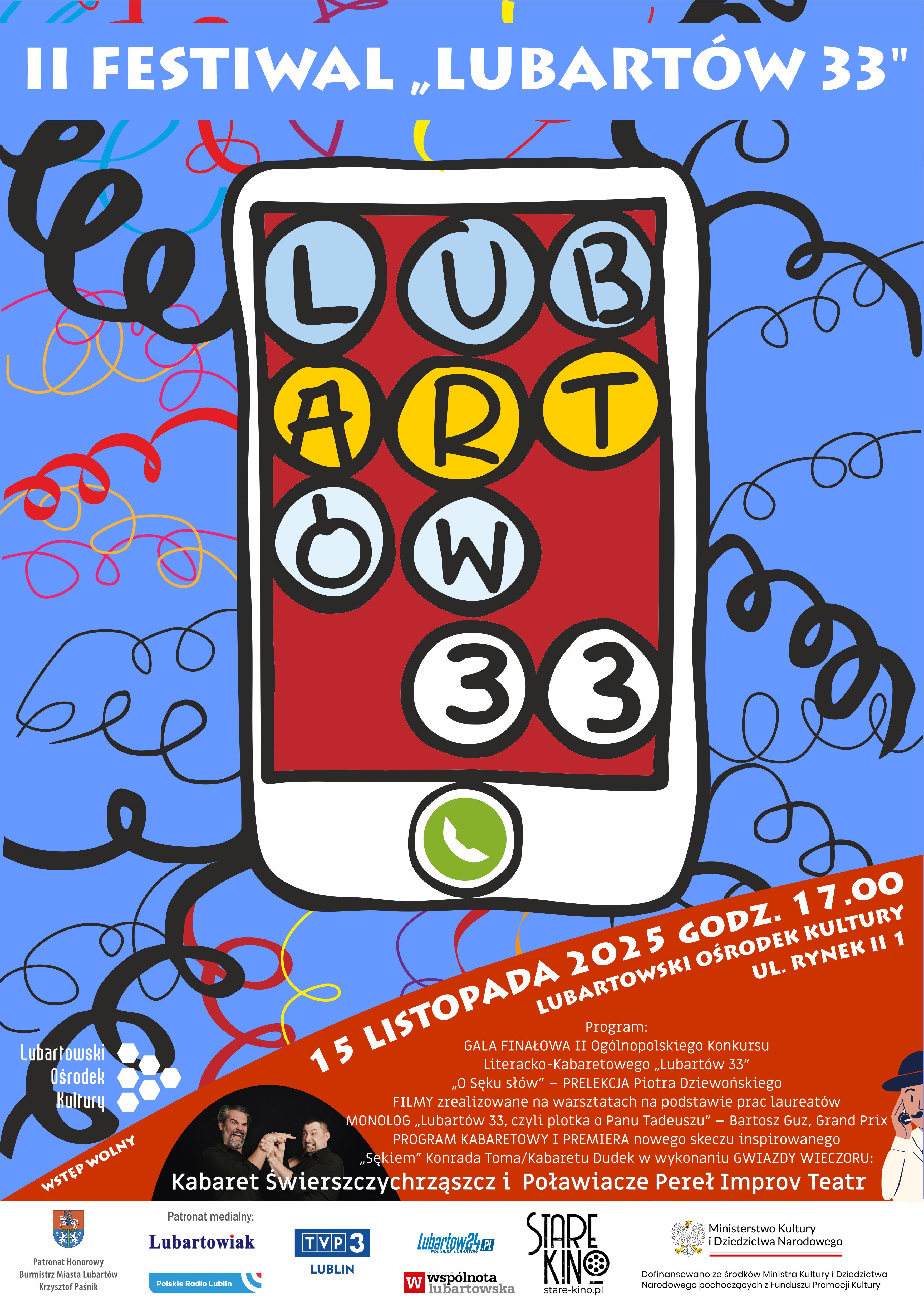 15 listopada 2025 r. o godz. 17.00 Lubartowski Ośrodek Kultury zaprasza na Finał II Festiwalu „Lubartów 33”, organizowany wokół słynnego skeczu „Sęk” Kabaretu Dudek, z którego słynie nasze miasto. Jako gwiazda wieczoru wystąpi Kabaret Świerszczychrząszcz i Poławiacze Pereł Improv Teatr.